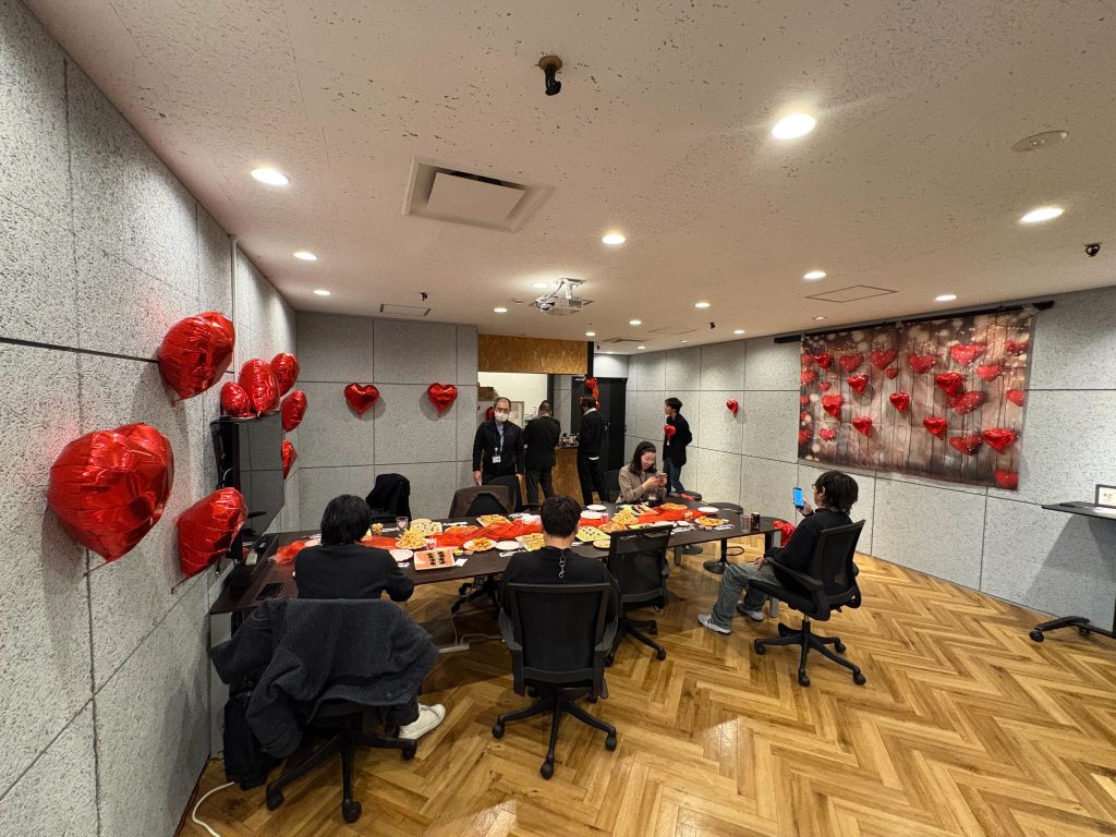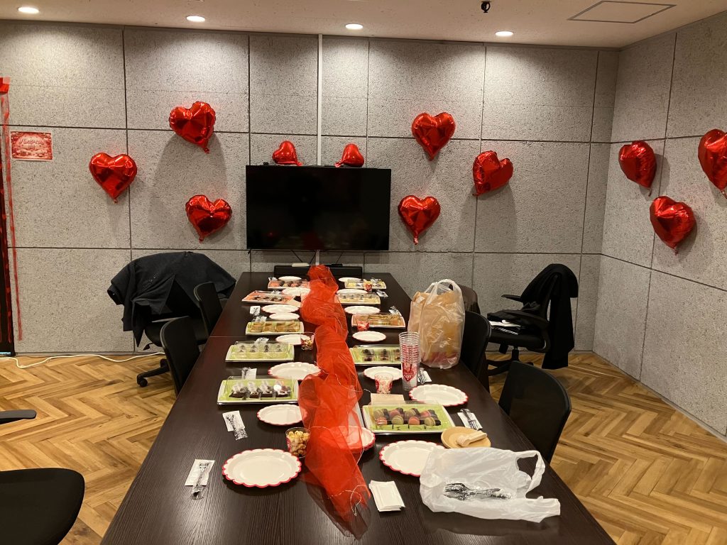 バナーやガーランド、ハート型バルーン、テーブルランナーで会場を彩り、社内会議室が一気にバレンタイン仕様に。会議室があっという間に”バレンタインの間”に変身しました!