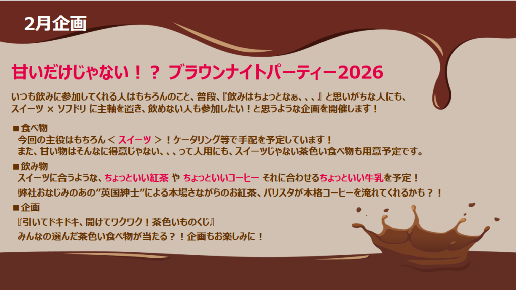 今回個別イベントとして2月に開催した「ブラウンナイトパーティー 2026」の様子をご紹介いたします!